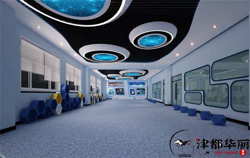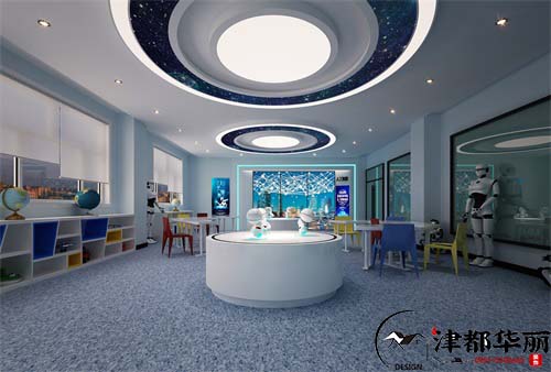 今天分享的是编程教室装修设计案例,应用蓝白线条打造出一个富有科技感的教室设计,顶部设计仿佛在浩瀚无垠的宇宙中飞行的飞船,周边灯光环绕,尤如夜空中最亮的星一样夺目。墙面上做了简介让学生可以多方面的认识学校。从教室穿出便来到了走廊,走廊使用纵向铝方通吊顶,地面也设计带有箭头的标识,外加蓝色灯条门框,整体犹如时空隧道一般引领着学子走向高端技术的未来。走廊两侧还有校园文化展示加深学校人文氛围感,蓝黄颜色搭配明亮中带着沉稳的感觉。机器编程技术融合了电子、造型、传感器、机械、人工智能等当今多项领域的先进技术,它不仅体现了对未来科技发展的认识,也是培养新世纪人才的重要举措。