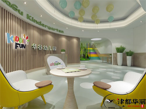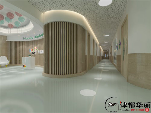 津都华丽今日分享案例,华谷幼儿园装修设计,此次幼儿园的设计,设计师致力打造一个安全环保,童趣童真的幼儿园,环保的木饰墙面、地面的装饰,让空间展示环保、安静的空间感。