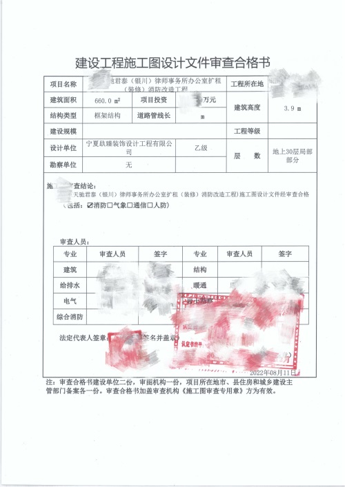 银川雷火体育官方注册推荐|银川天驰君泰律师办公室消防审图合格报告书