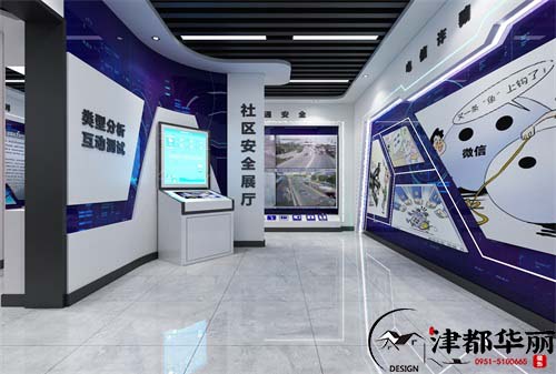 本次项目是警务展厅的装修设计,在设计的时候设计师首先考虑到警务室本身的特点和社会职能,蓝色作为警务的代表色彩,在设计中必定是空间的主色调,白色作为辅助色,这样的色彩搭配会突出空间的主题,并且还很时尚,在视觉上会显得整齐和谐,美观大方。其次就是整体空间的合理划分和展厅各个板块的内容,板块内容主要分为警务文化、禁毒、电信诈骗、消防安全、安全等,根据板块内容,设计师将空间合理的划分,使展厅内容连贯畅通,并且通过文字图片、电子科技产品等形式向我们简单生动的展示了内容,让我们能够身临其境的融入到环境,更好地去理解展厅的展示内容,以达到更好的宣传效果和有效的传递正能量,这就是展厅设计的最终目的。